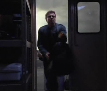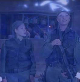 Amanda Tapping s'apprête à rejoindre la scène : elle apparait cependant dans le champ de la caméra.