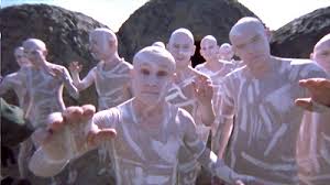 Aspect : Chauves et nus, ils sont couverts d'une peinture corporelle qui leur fait une sorte de seconde peau. Certains portent des perles blanches autour du cou. Il n'y a pas de différences évidentes entre les mâles et les femelles. Les aliens n'ont pas de pouls détectable, et l'organe qui correspond au coeur est situé là où se trouverait l'estomac chez un humain.